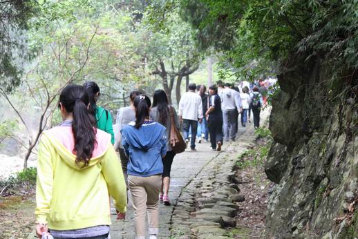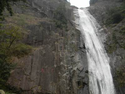 船这时间已经行使到了一片长满水葫芦的狭窄水面,,,,,,,,绿油油的水葫芦盖住了游轮的前进偏向,,,,,,,,船也最先靠岸了。。。。。我们下船上了岸,,,,,,,,岸上是一条由水泥铺成的平展的路,,,,,,,,路面也很宽,,,,,,,,一直通向前方。。。。。我们约莫走了三、四里路,,,,,,,,山路最先陡起来了,,,,,,,,溪水也变的很湍急。。。。。当我们爬上一个小山包时,,,,,,,,我们的眼前突然泛起了一条从天而降的水帘,,,,,,,,高约百米,,,,,,,,水柱飞入一口碧玉般的水潭里。。。。。在水潭边上有一块平如磨刀石的玄色石头,,,,,,,,上面有鲜红的“葫芦飞瀑”四个大字,,,,,,,,各人纷纷在这里照相留念。。。。。时间到了中午,,,,,,,,我们上船就中餐后,,,,,,,,搭船返回。。。。。